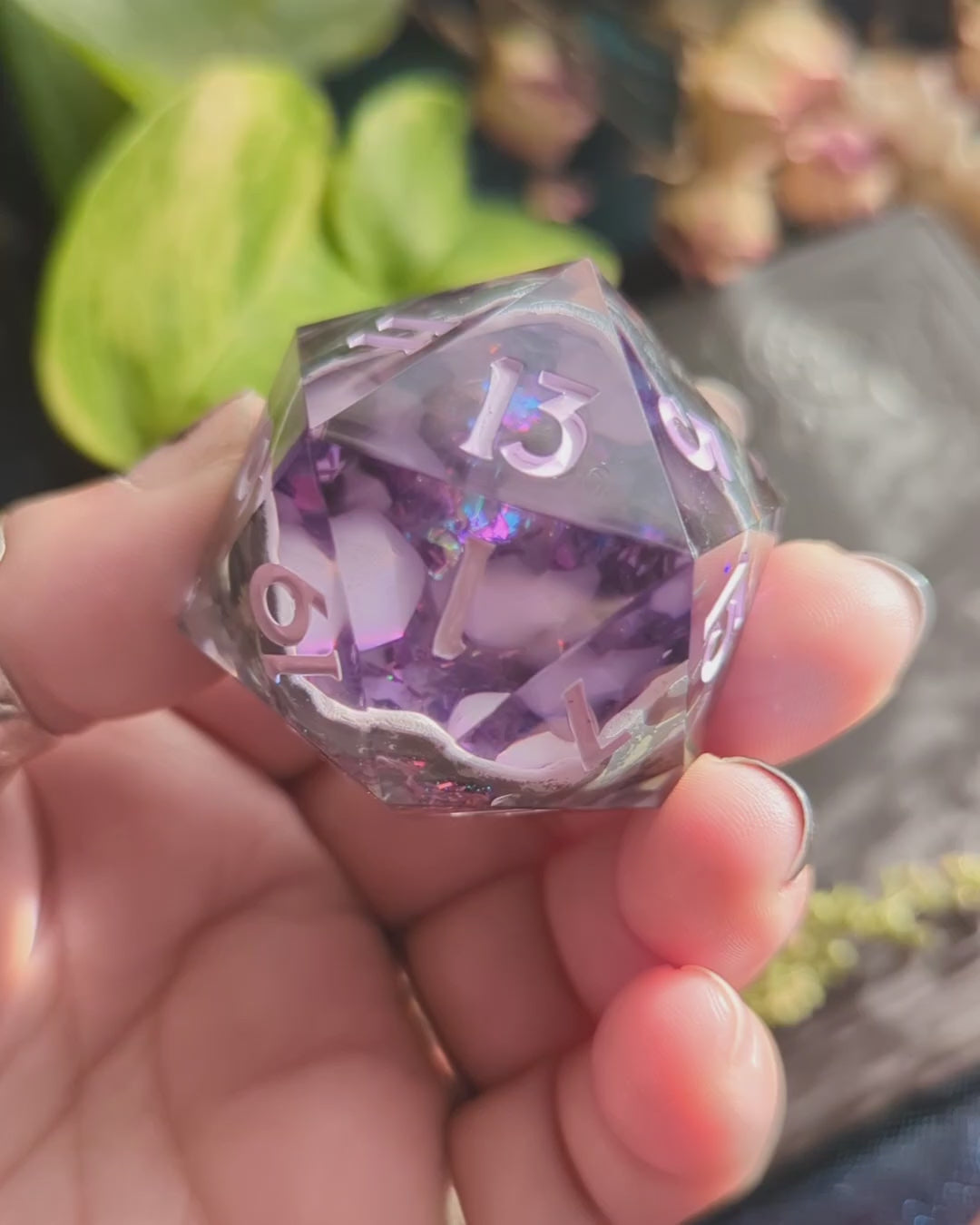 A tiny underground world that fits in the palm of your hand! This 40mm chonk d20 features a 3D printed geode insert with glitter flakes and glow in the dark miniature d20 shapes inside. It is inked in matte lavender paint.