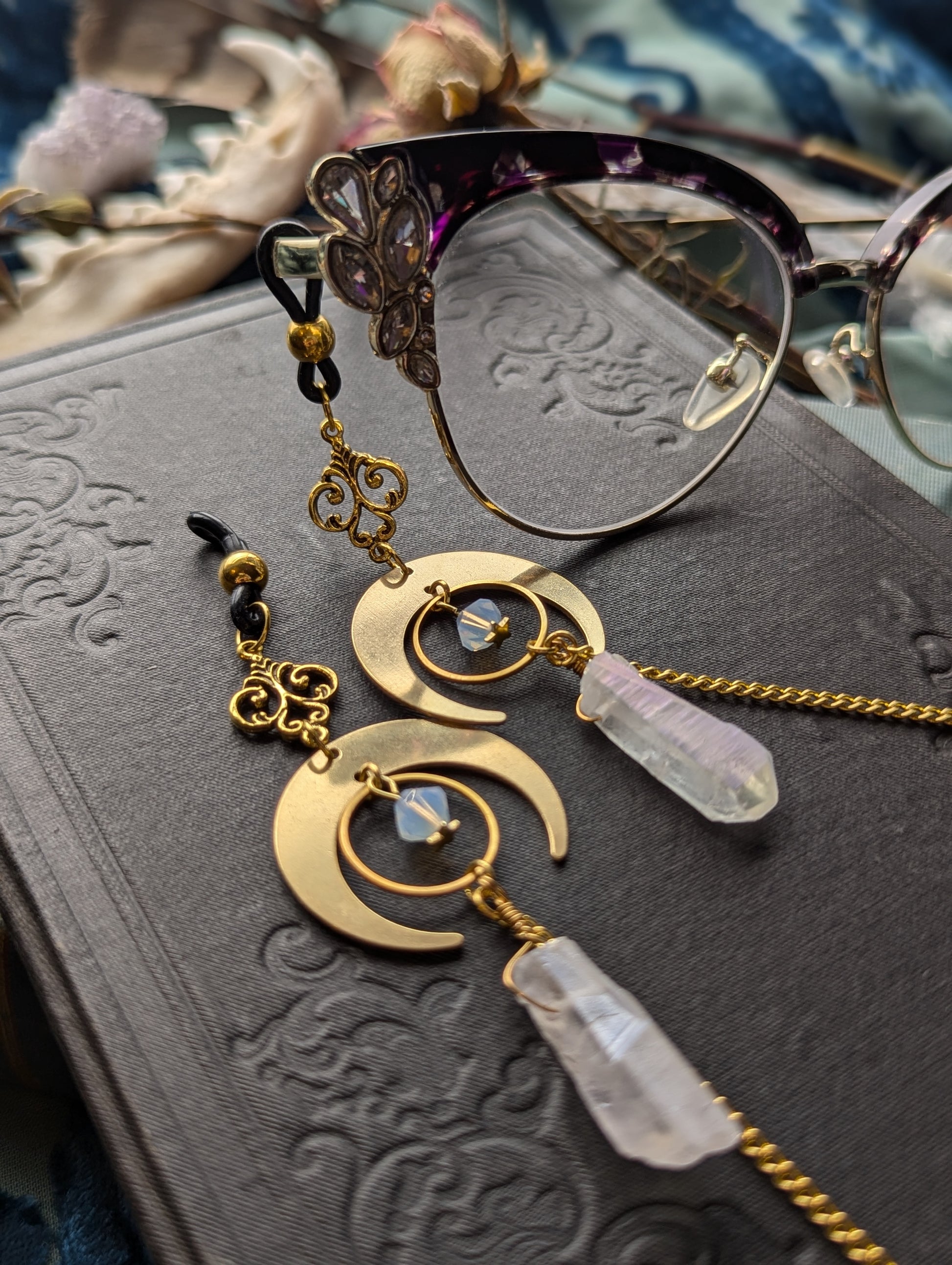 These eyeglasses chains feature gold colored brass crescent moons and filigree charms, as well as raw quartz crystals. The chain is gold plated stainless steel.