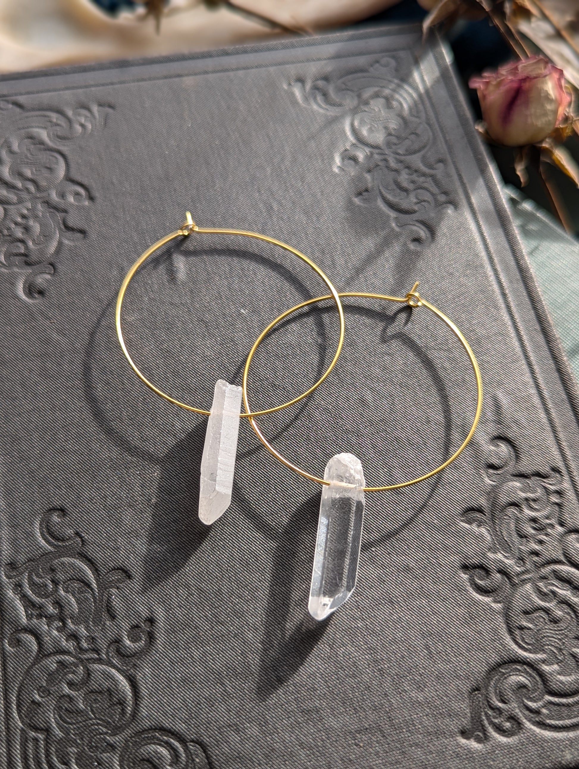 These earrings feature a raw quartz crystal point on 1 3/4" wire hoops. The ear wires are gold plated stainless steel.