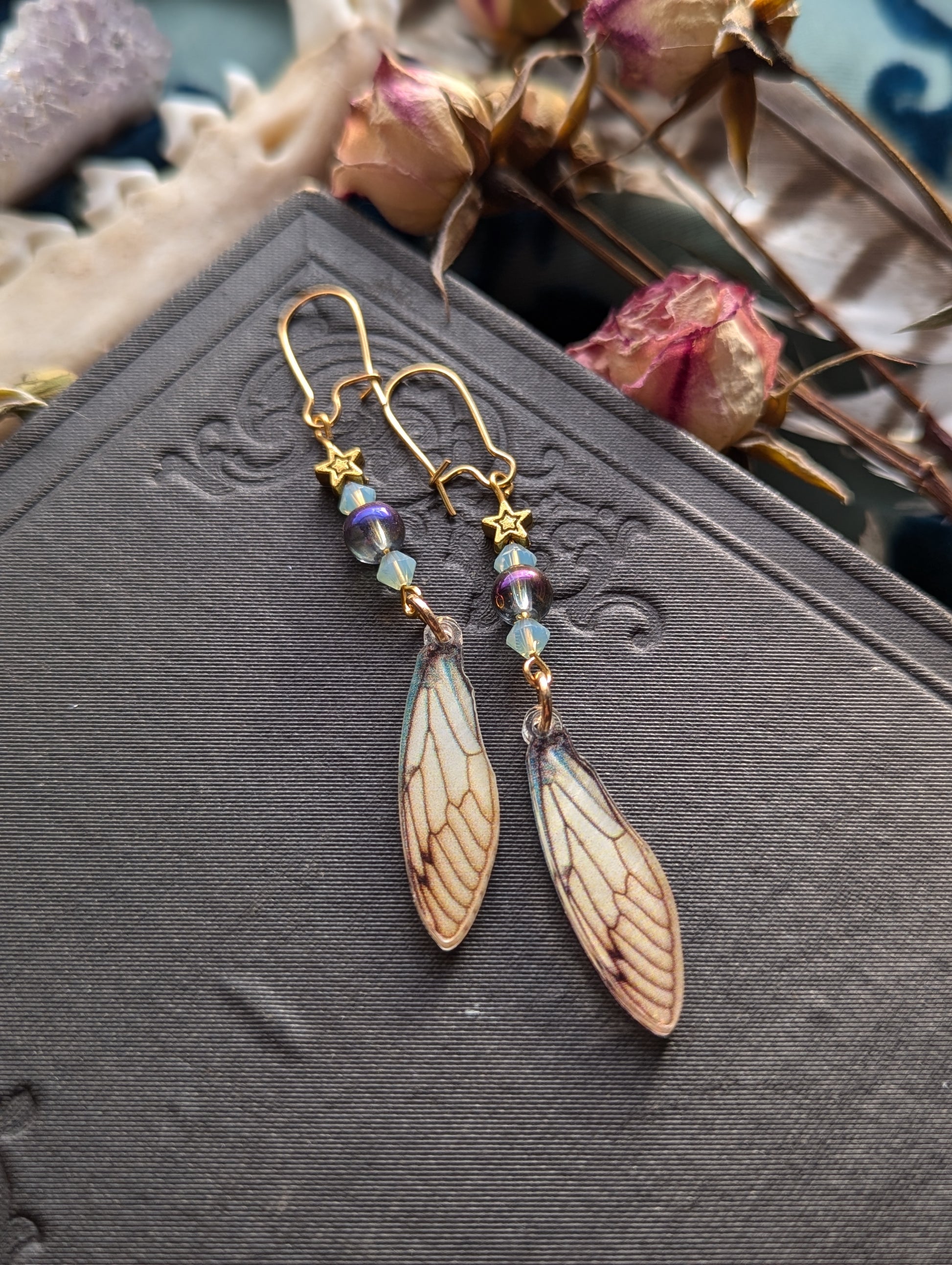 These earrings feature an acrylic wing charm dangling from multi-colored beads. The earring wires are gold plated stainless steel.