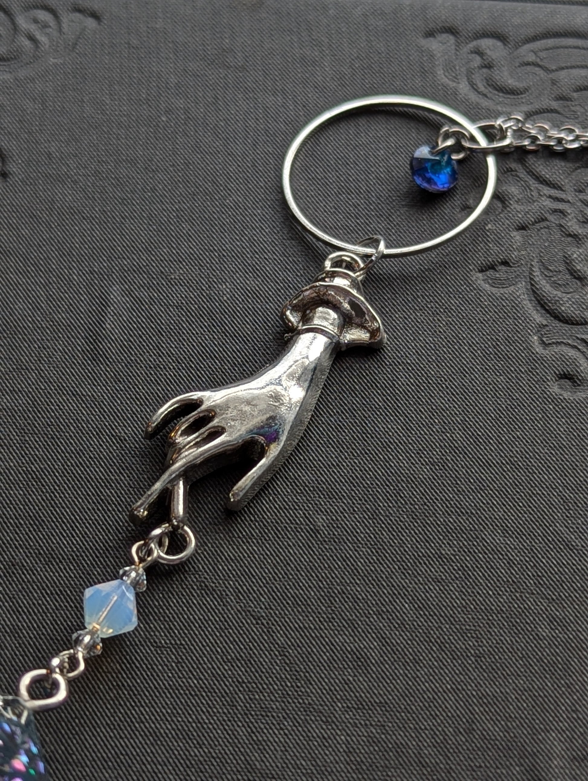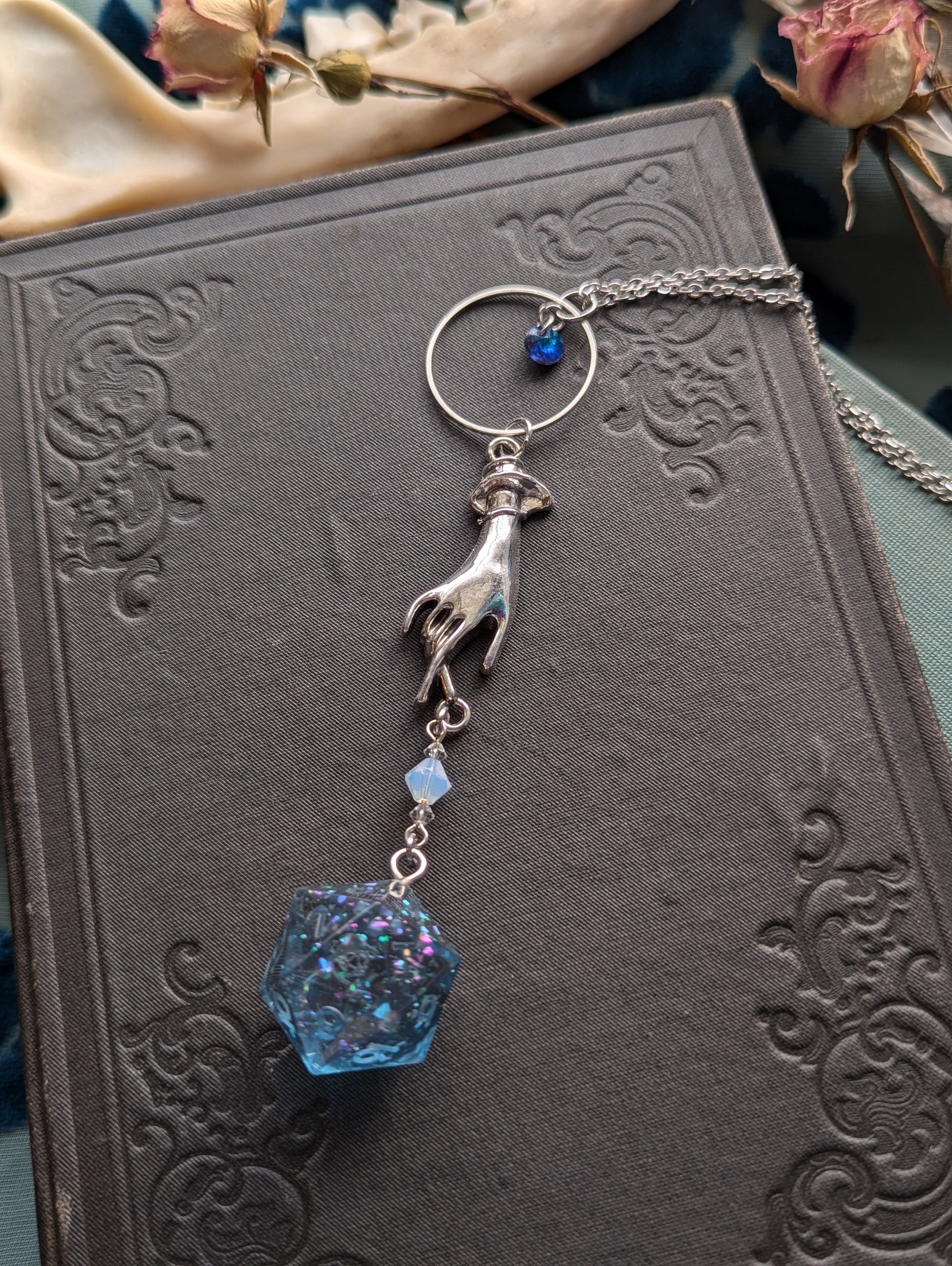 This necklace features a dusky blue handmade d20 suspended from a silver colored hand and circle. The necklace chain is stainless steel.