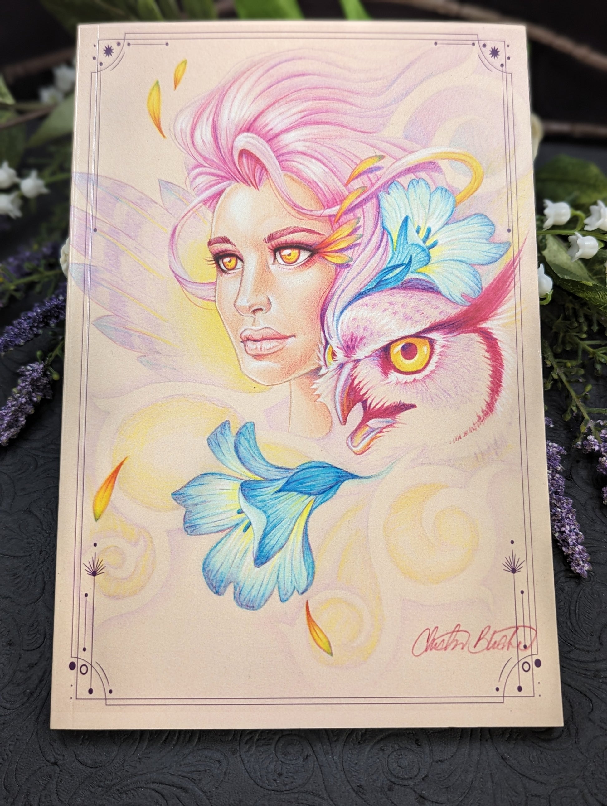 This 6"x9" notebook is fantastic for taking session notes, DM worldbuilding notes, or just an every day journal! Featuring a glossy cover with original colored pencil artwork by me! This notebook has dot grid on the left and lined pages on the right, perfect for drawing maps and keeping notes, as well as 120 pages.