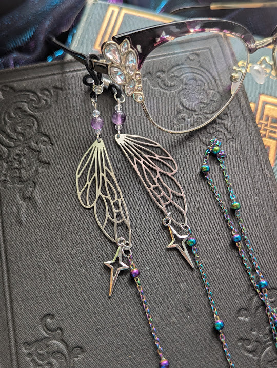 These eyeglasses chains feature silver toned fairy/insect wings with real amethyst beads and north star charms.