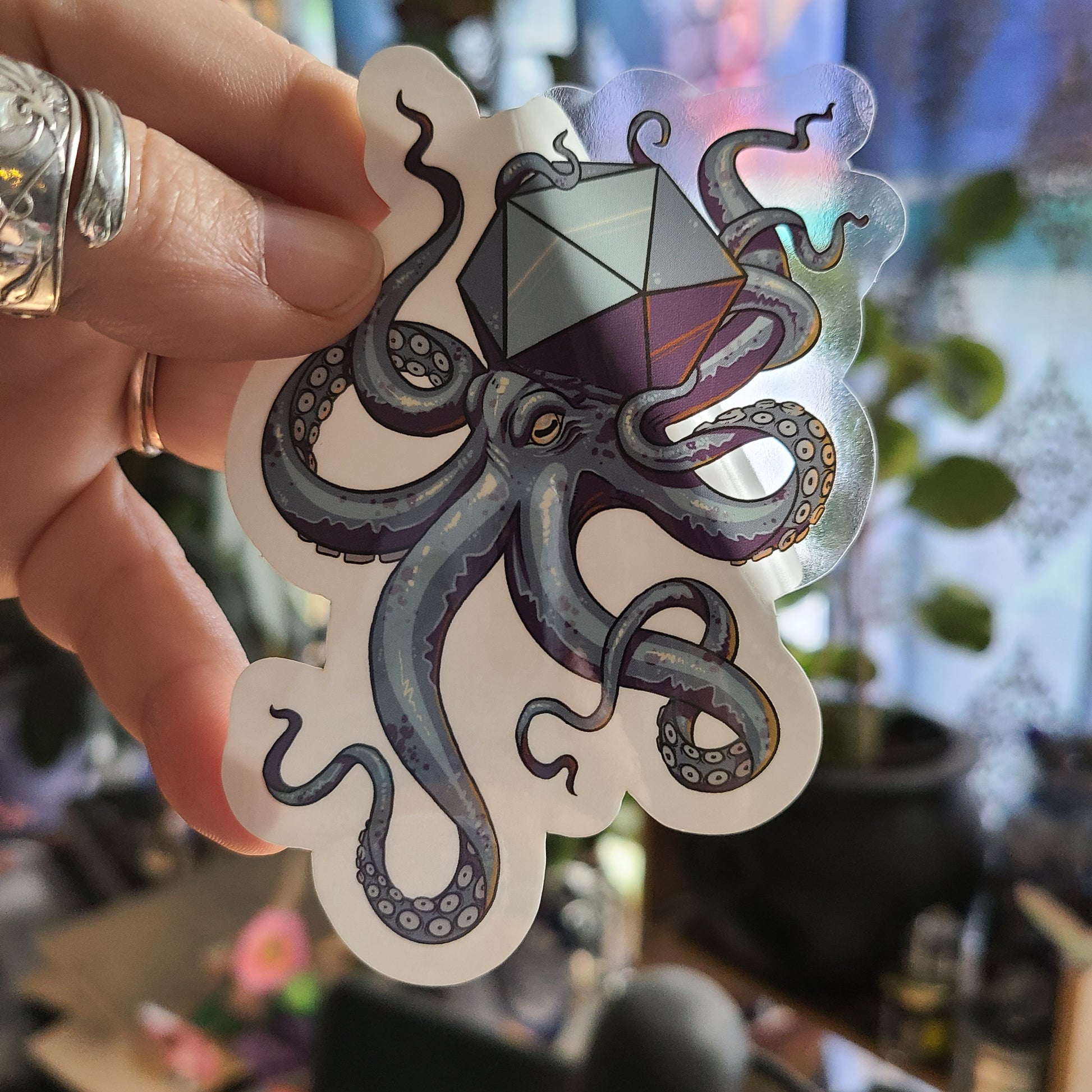 This 4" tall glossy sticker features a d20 octopus, ready to protect your dice hoard, or instill fear into your enemies! They are printed on a clear backing so they will look great on any surface!