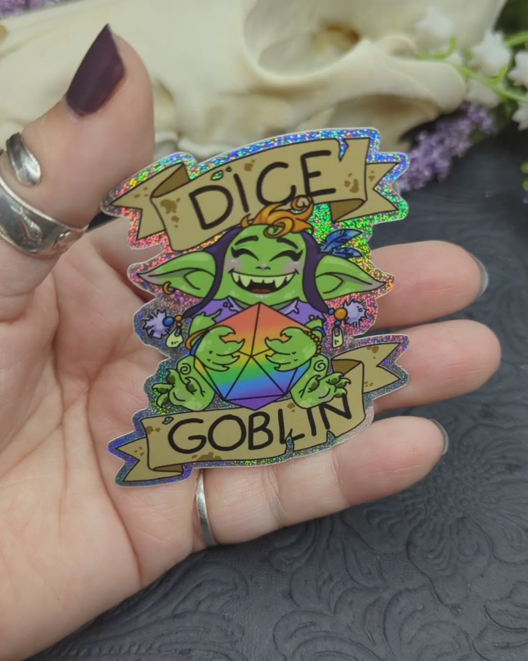 This 3" tall glossy sticker features an adorable dice goblin hugging a rainbow colored d20! They are printed on a holographic glitter backing so they will look great on any surface!