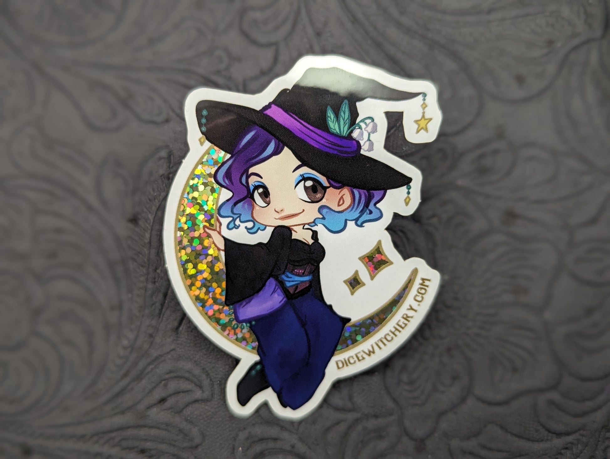 Featuring the Dice Witchery chibi shop mascot, this 3" sticker is glossy with holographic details. Artwork by the amazing Arcane Moon Studio!