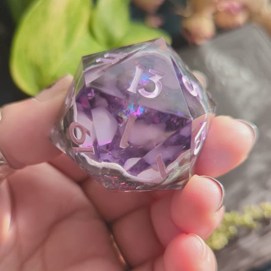 A tiny underground world that fits in the palm of your hand! This 40mm chonk d20 features a 3D printed geode insert with glitter flakes and glow in the dark miniature d20 shapes inside. It is inked in matte lavender paint.