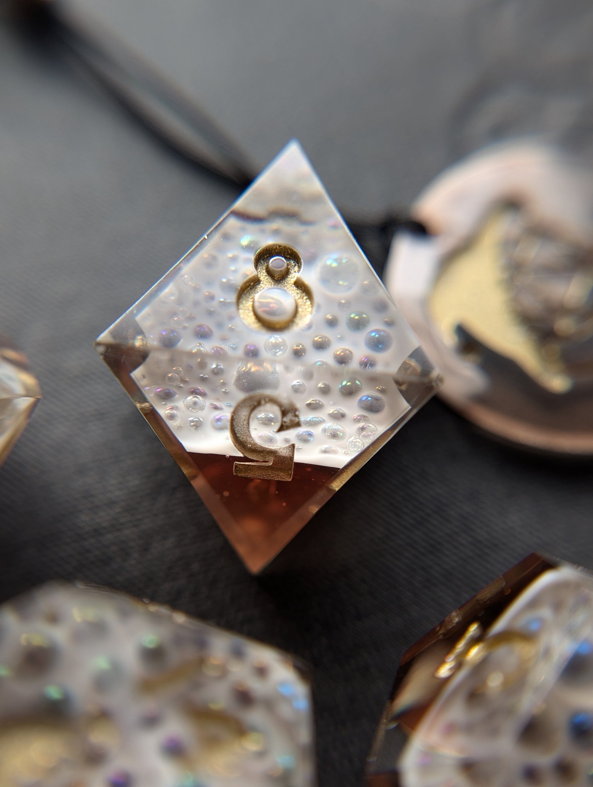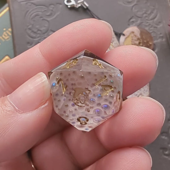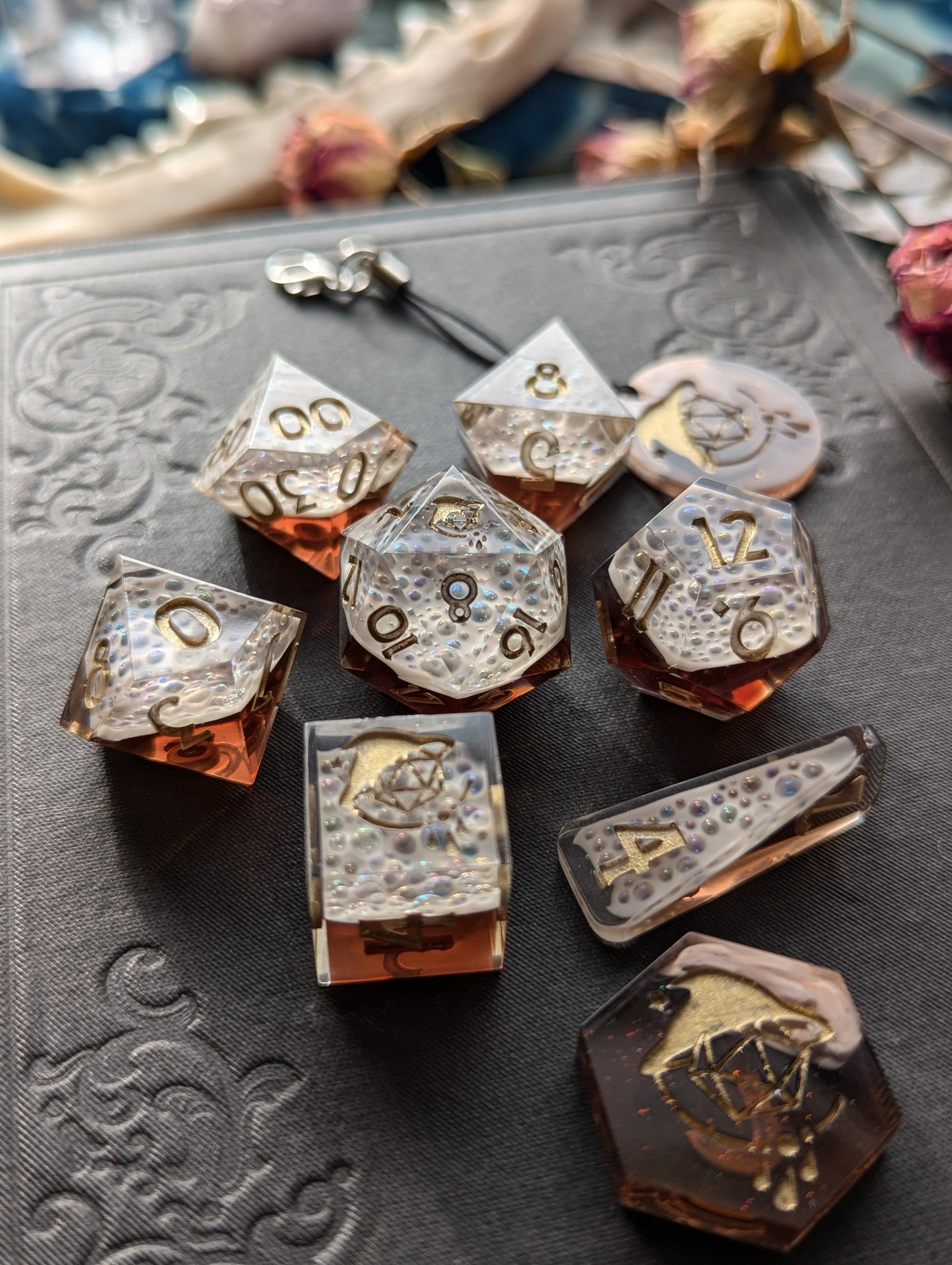 Playing a Drunken Master Monk? Or maybe a Dwarven Brewmaster? Or maybe you just really appreciate a frothy pint? These dice are for you! Each die consists of a transparent dark brown glitter layer, a white "foam" layer with UV resin bubble beads, and a clear resin layer. They are inked in gold paint.