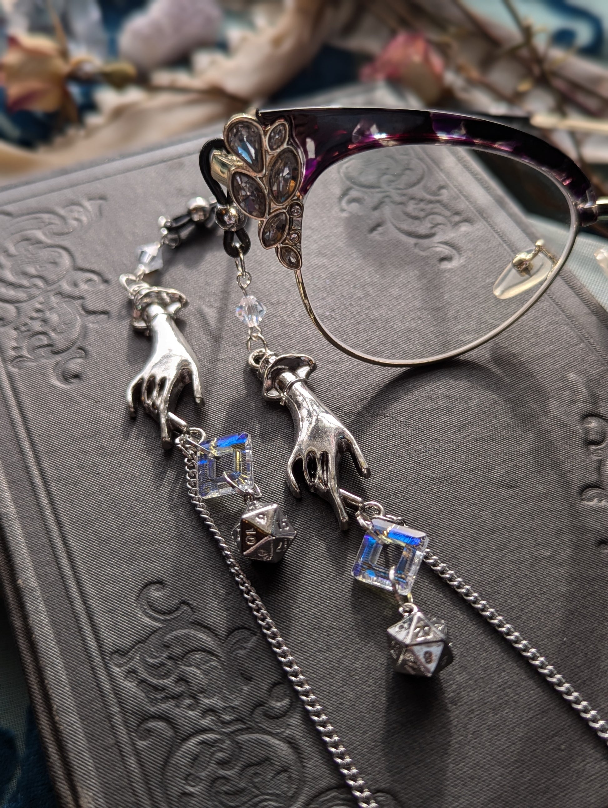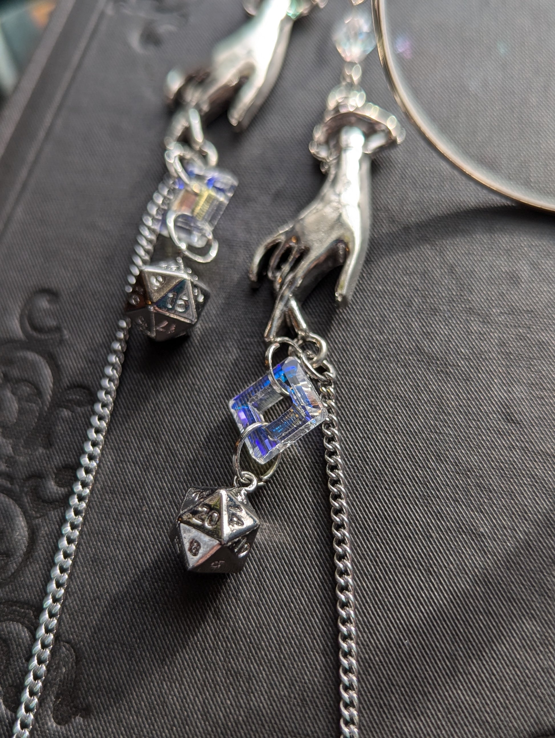 These eyeglasses chains feature silver toned hands with AB faceted glass charms and a silver plated d20 . The chain is stainless steel.