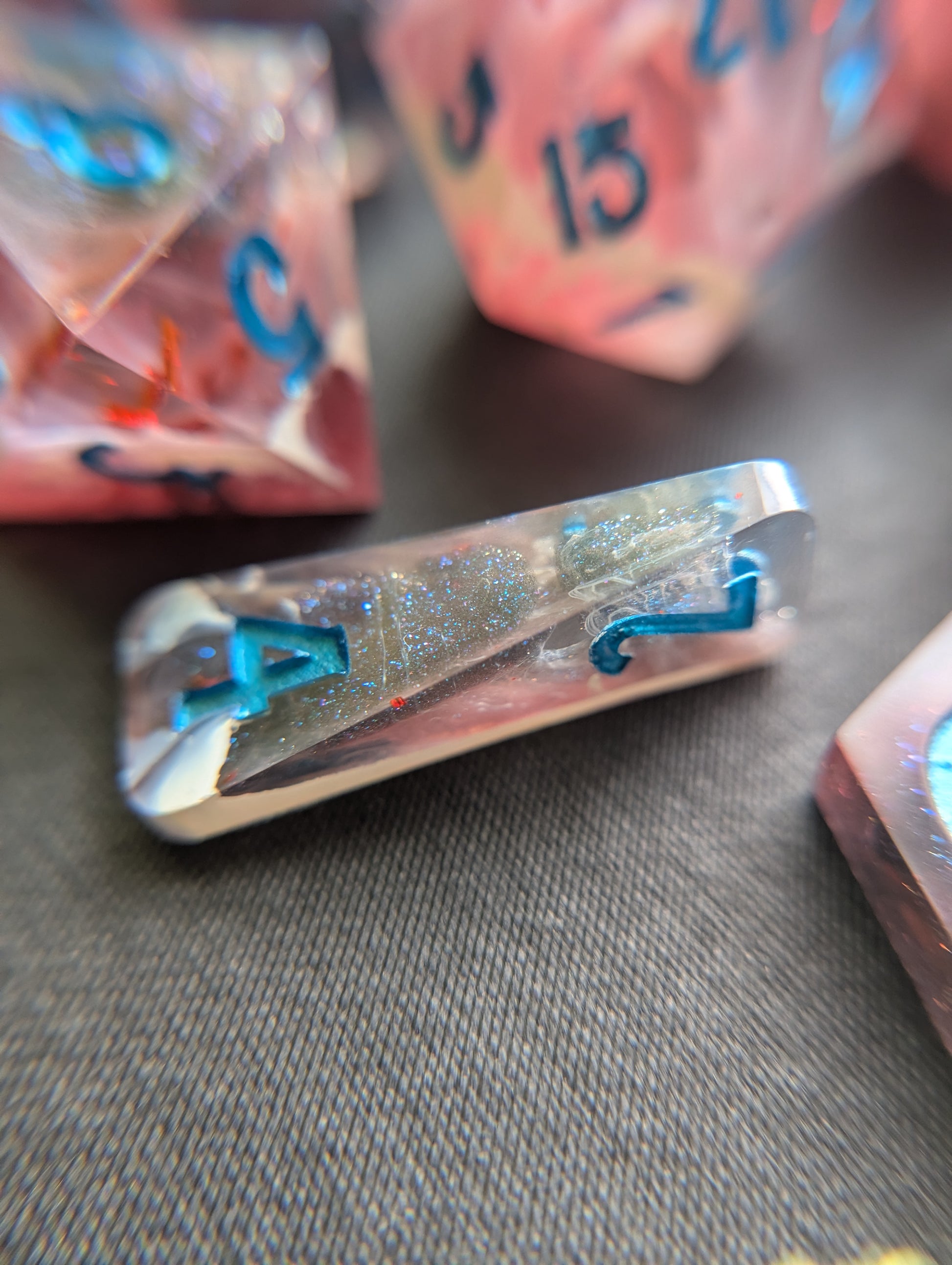 This is a set of handmade resin dice. While I strive to make them as perfect as possible, there may be small imperfections and marks from the handmade process that will not affect gameplay in any way.