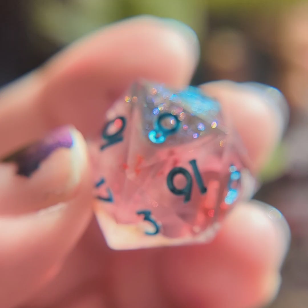 If you've ever tasted huckleberry, you know it has a magical quality unlike anything on this planet! This set of dice embodies that (minus the flavor, don't kronch) with a berry colored base and swirls of white and colorshifting blue glitter. They are inked in metallic blue.