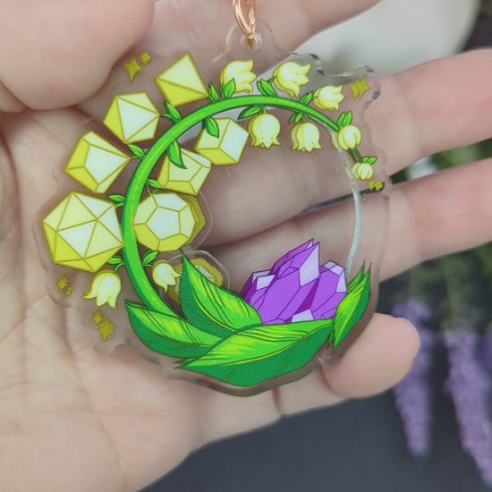 A fun shaker keychain featuring lily of the valley flowers, purple crystals, and tiny d20 dice charms inside! Clip it to your keys, backpack, or dice bag! Keychain measures 2.5" at the widest point, and is double sided.
