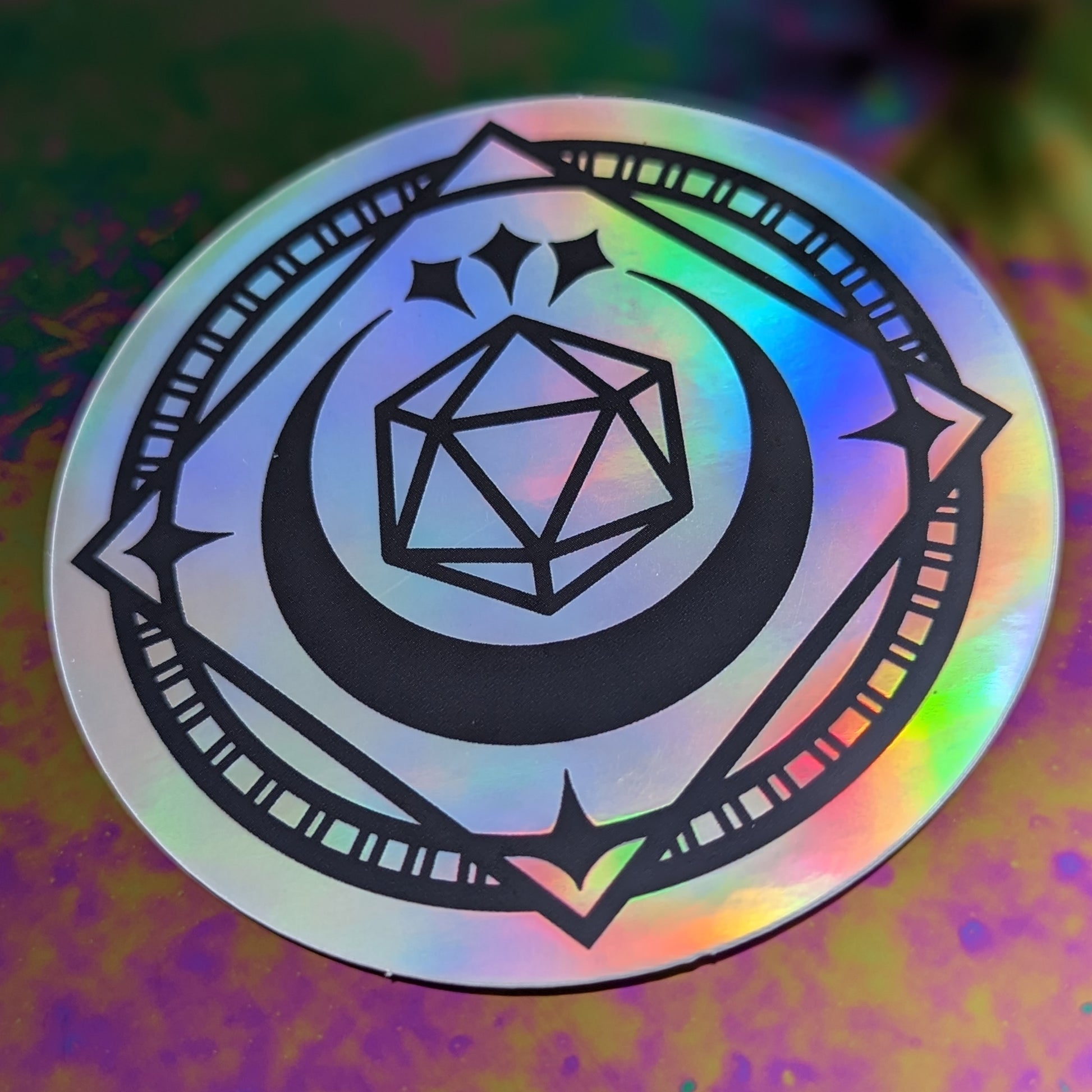 A simple yet powerful arcane circle design featuring a crecent moon and a d20. This 3" sticker has a holographic background under a black design.