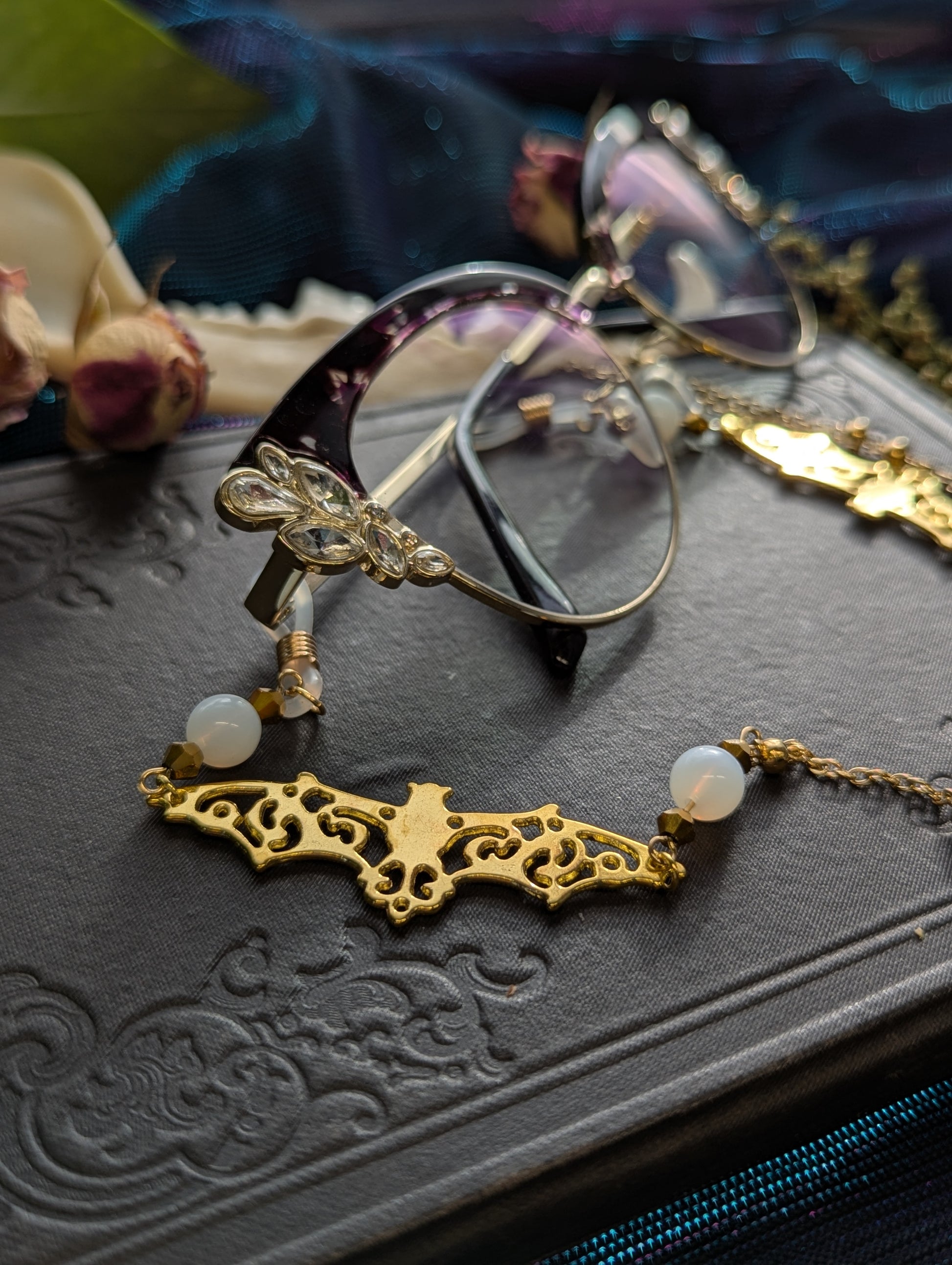 These eyeglasses chains feature metal filigree bats and opaque white moonstone beads.