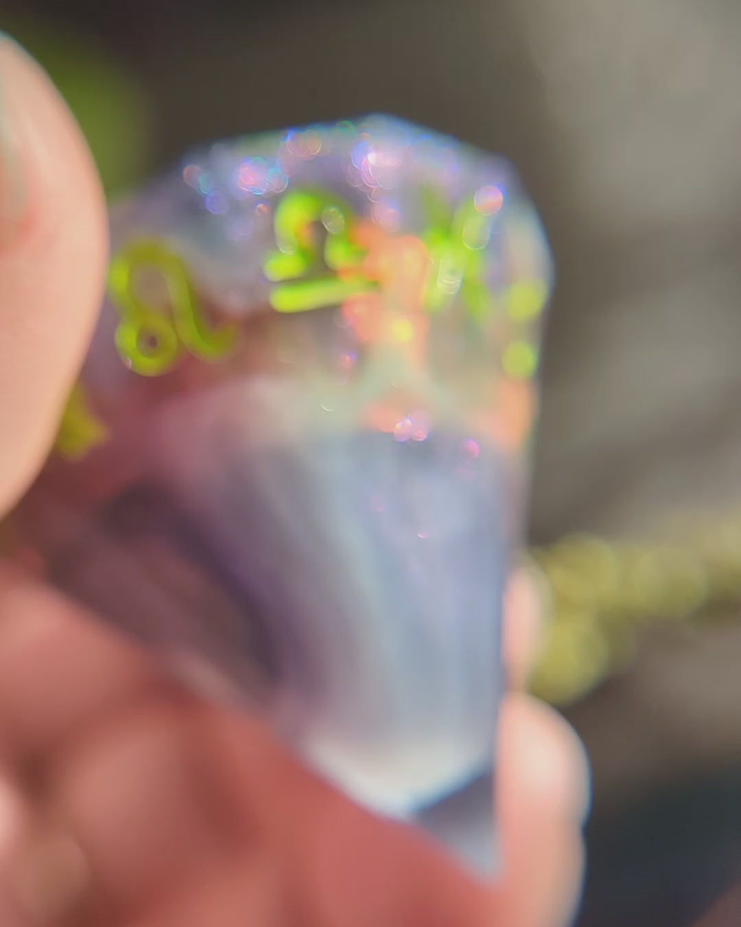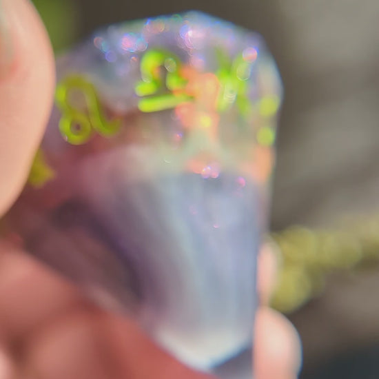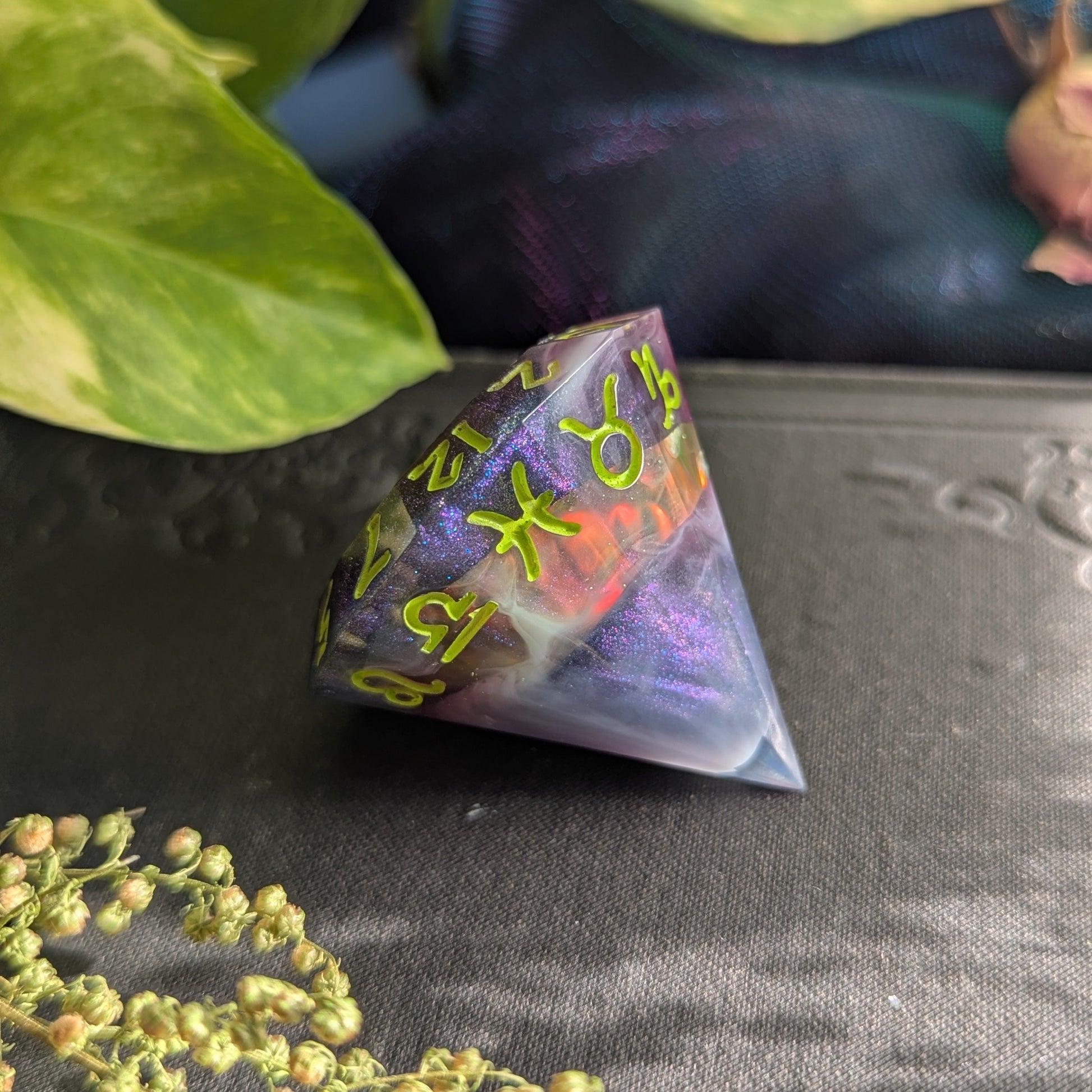 Dark purple swirls hide flashes of unnatural lightning... This d12 features a unique gem shape with zodiac signs along the edge. It's made of swirls of dark purple colorshifting glitter, smoky white, and bits of UV reactive iridescent film. It is inked in bright green paint.