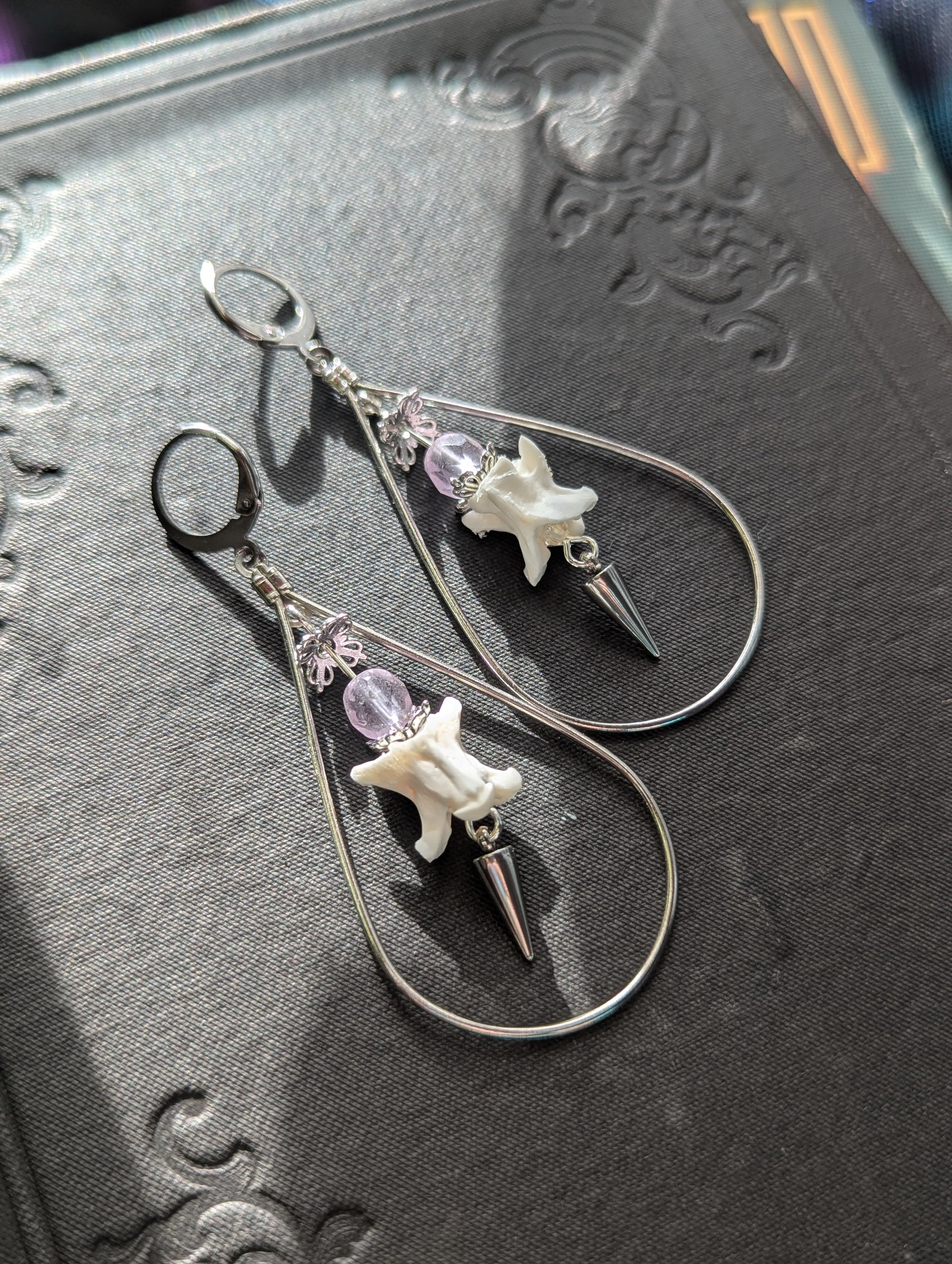 These earrings feature silver and gold colored teardrop hoops with real snake vertebrae, amethyst beads and a spike suspended from them. The ear wires are nickel free stainless steel or 24K gold plated stainless steel lever back style that can be worn in regular and gauged ears.