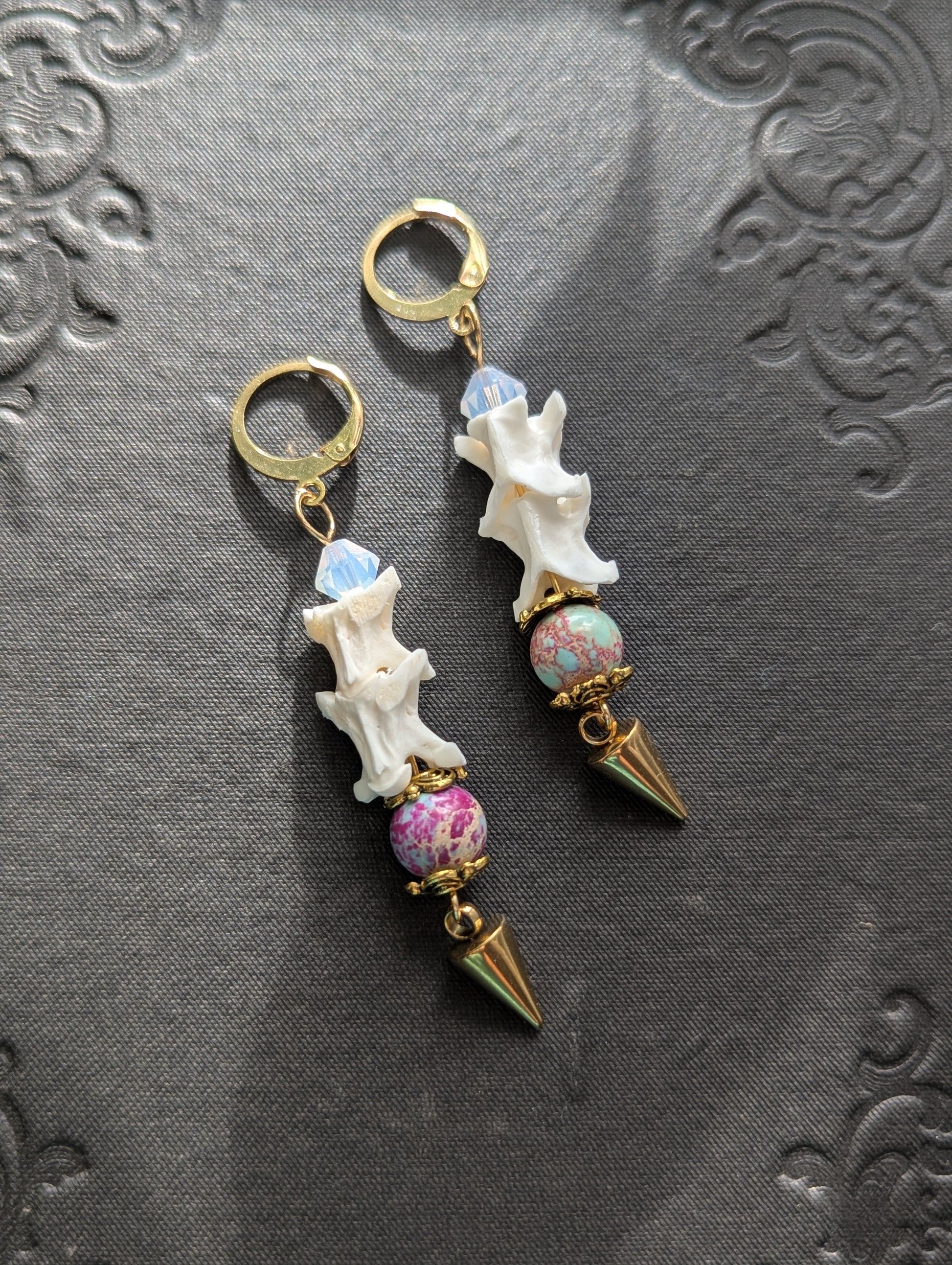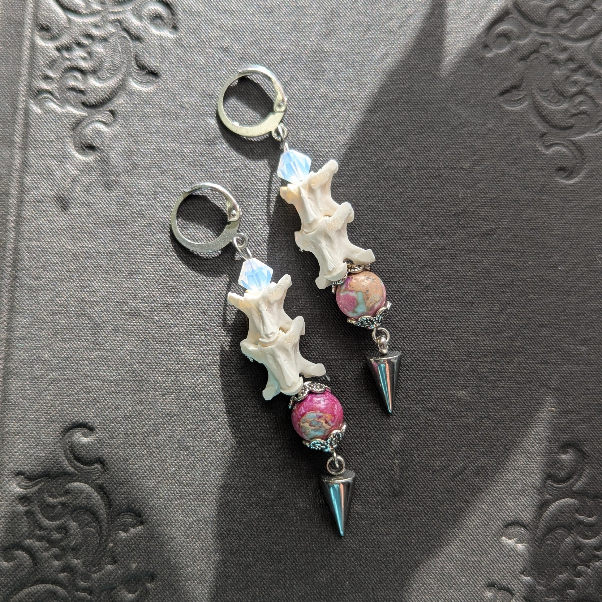 These earrings feature opalite beads, real snake vertebrae, and dyed ocean jasper beads, with a spike dangling from each. The ear wires are nickel free stainless steel or 24K gold plated stainless steel lever back style that can be worn in regular and gauged ears.