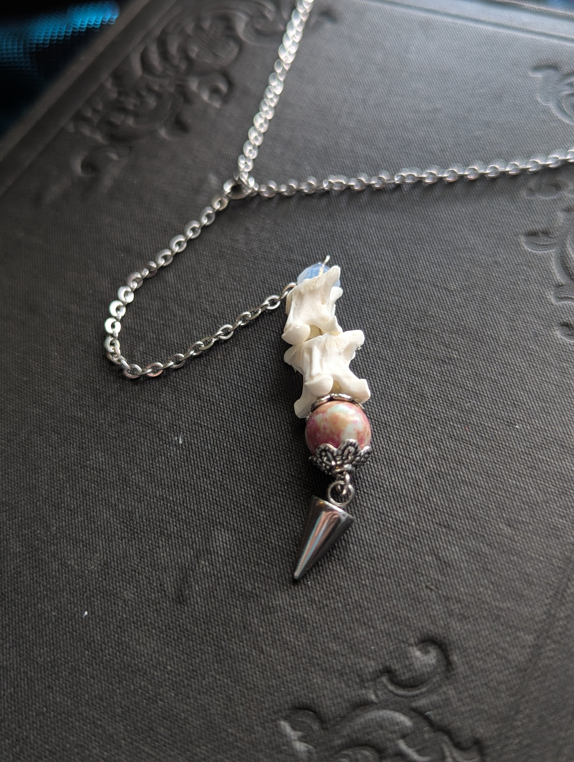 These earrings feature opalite beads, real snake vertebrae, and dyed ocean jasper beads, with a spike dangling from each. The chain nickel free stainless steel or 24K gold plated stainless steel and is 24" long.