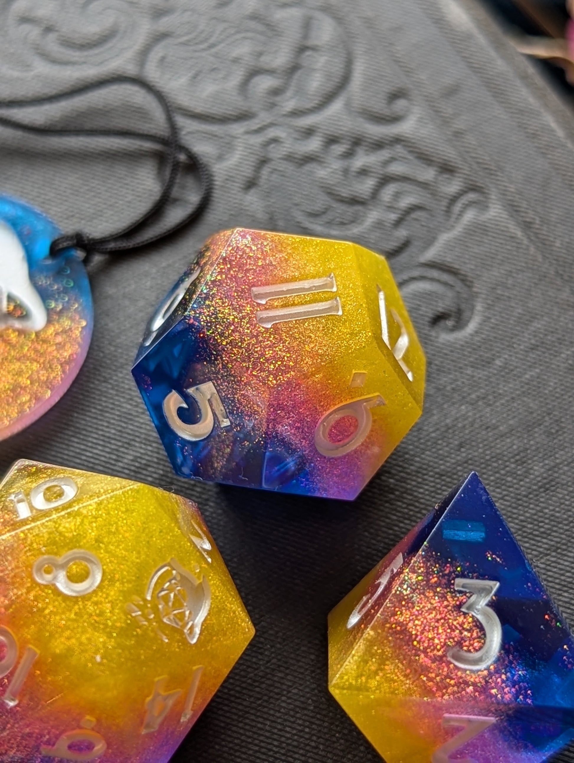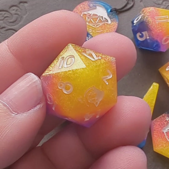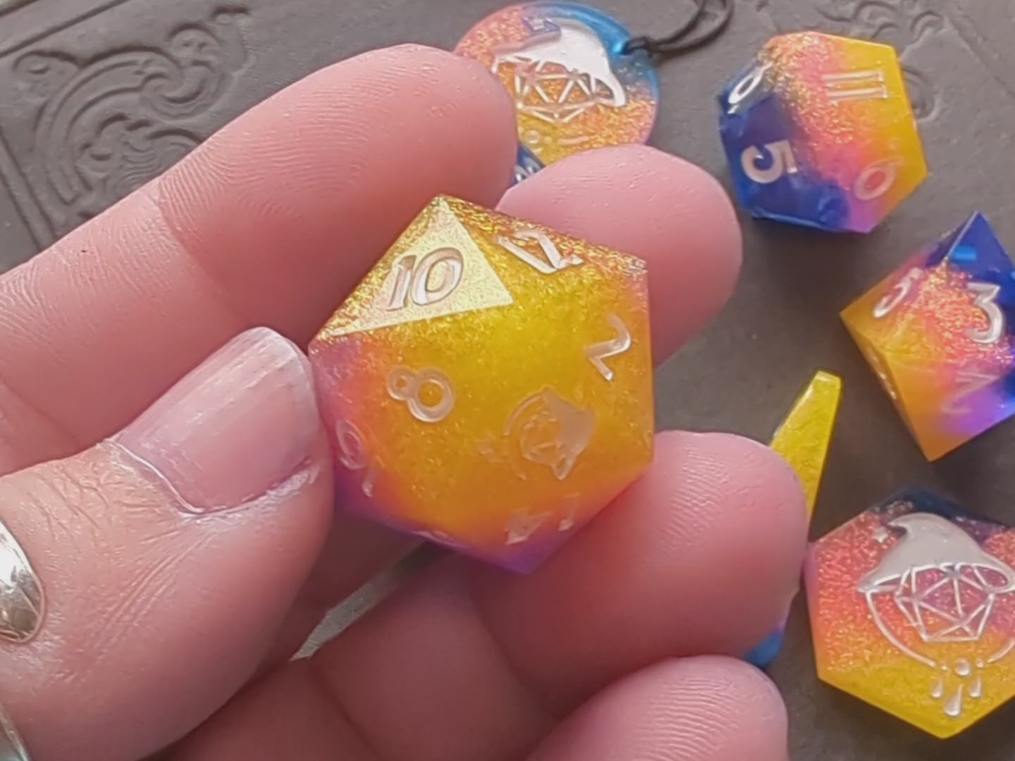 This is a set of handmade resin dice. While I strive to make them as perfect as possible, there may be small imperfections and marks from the handmade process that will not affect gameplay in any way.